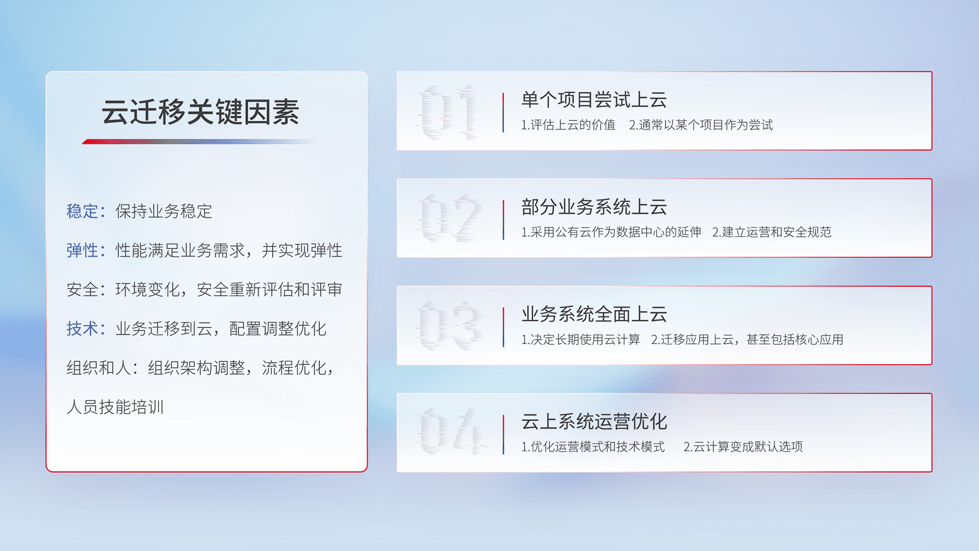 结合实际业务,,,从规划设计、、、、云平台选型、、云原生改造、、、数据迁移、、、集成交付,,,迁移全过程为客户识别最佳上云路径,,做好风险识别管理,,设计网络架构、、、、身份权限、、、安全审计合规、、、、操作审计、、日志审计、、、监控告警策略、、多站点容灾设计等,,,对云上基础设施进行整体规划,,,,提升IT治理水平,,,,以满足弹性、、、、高可用、、、、高性能的需求。。。